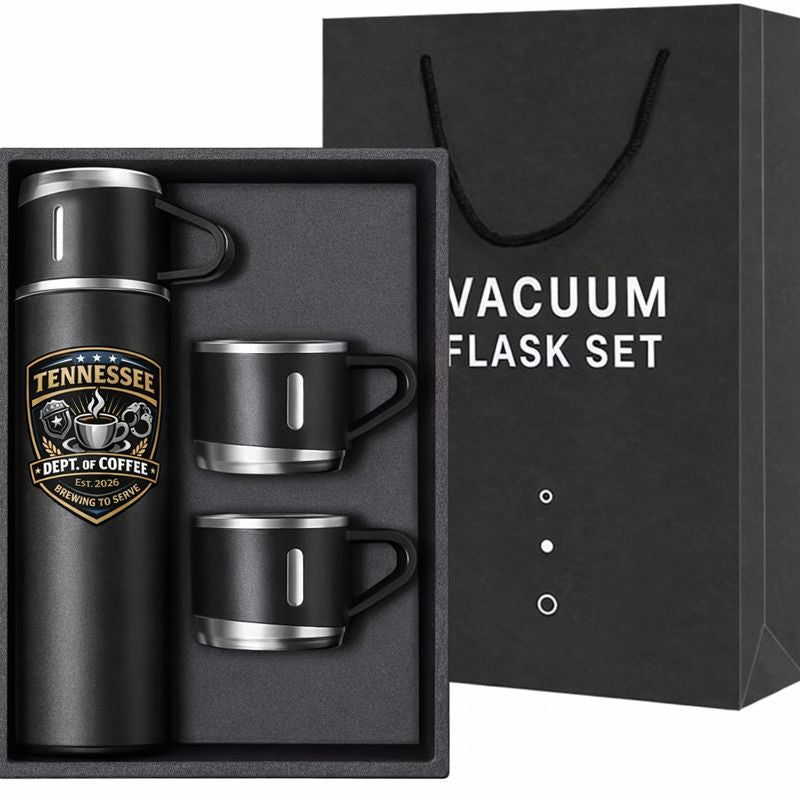 Stainless steel flask with 'Tennessee Dept of Coffee' logo and accessories on a white background